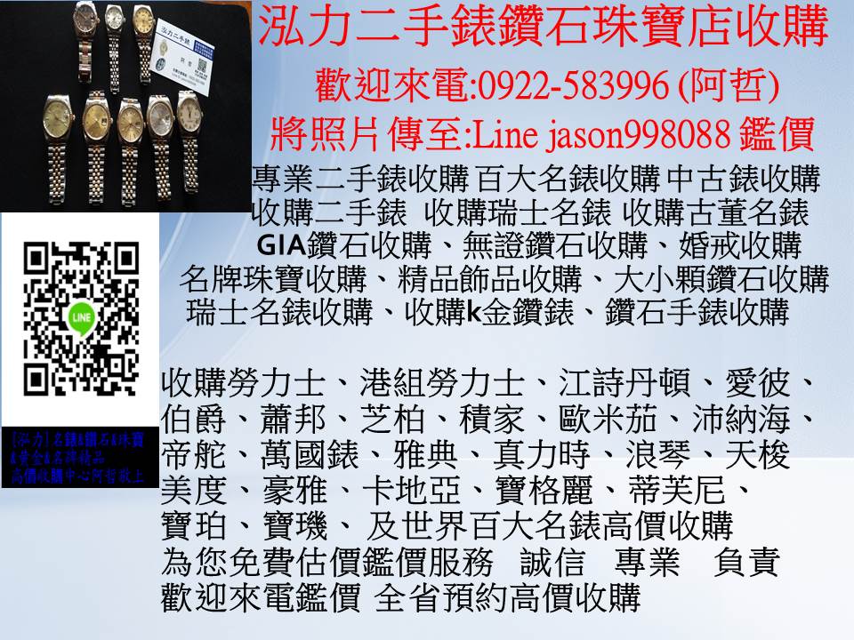 全省高價收購專線:0922583996 阿哲 泓力二手錶 LINE ID : jason998088 ~傳圖片,為您鑑價~ WeChat ID : jason998088 ~傳圖片,為您鑑價~ E MAIL : jason998088@gmail.com ~傳圖片,為您鑑價~ 高價收購 現金交易 全省預約服務 大台北服務 為您免費估價鑑價服務。 誠信 專業 負責 ~~歡迎來電洽詢~~ 高級名錶高價收購 機械錶收購 石英鑽錶回收 勞力士錶收購、收購百達翡麗、收購江詩丹頓、收購寶珀錶、收購寶璣錶、收購愛彼、收購格拉蘇蒂錶、收購法蘭克穆勒、收購伯爵錶、收購蕭邦錶、收購芝柏錶、收購積家、收購百年靈、收購格林漢、收購歐米茄錶、收購帝舵錶、收購沛納海錶、收購萬寶龍錶、收購IWC萬國錶、收購浪琴錶、收購美度錶、收購天梭錶、收購真力時錶、 收購波爾錶、收購豪雅錶、收購豪利時錶、收購雅典錶 收購愛寶時、收購沛納海錶、收購寶齊萊錶、收購蒂芙尼錶、收購卡地亞錶、收購香奈兒錶、收購寶格麗錶、收購路易·威登錶、收購愛馬仕錶、收購星辰表錶、收購雷達錶、收購精工錶錶、蘇黎世鑽錶手錶…..世界百大名錶收購買賣交流 收購勞力士老錶、港製勞力士收購、K金手錶收購、老款勞力士收購、機械錶收購、石英錶收購、精品珠寶手錶收購、收購古董鐘錶、K金手錶收購、古董手錶收購、收購鑽石手錶、懷錶收購、中古錶收購、二手手錶收購 、故障手錶收購、手錶配件收購、收購積家空氣鐘、男女鑽錶收購、代客贖回當鋪手錶、舊勞力士錶收購 鏤空手錶 收購懷錶回收舊錶 收購名錶 勞力士金錶 收購二手錶店代客贖回當鋪手錶、代客贖回當鋪珠寶鑽石、黃金收購、白金收購、k金回收 高價鑽石珠寶收購回收 收購鑽石,鑽石鑽戒,鑽石手鍊,鑽石項鍊,鑽石手環、k金戒指、鑽石線戒、紅寶石,藍寶石、黃金收購、白金收購、貴金屬回收 收購珠寶、鑽石收購、收購Tiffany鑽戒,卡地亞鑽石珠寶、收購BVLGARI珠寶、收購卡地亞(Cartier) 收購寶格麗(Bvlgari) 收購蒂芬妮 (Tiffany & Co.)收購伯爵(Piaget) 收購蕭邦 收購格拉夫(GRAFF) 收購梵克雅寶(Van Cleef & Arpels)收購戴比爾斯(DE BEERS) 收購戴瑞(DarryRing) 收購海瑞溫斯頓(Harry Winston) 收購寶詩龍(BOUCHERON) 收購戴瑞(Darry Ring) 收購蒂爵(DERIER) 收購德米亞尼(Damiani) 收購御木本(MIKIMOTO)、收購香奈兒‧‧‧‧收購各大品牌精品 鑽戒,鑽石,手鍊,項鍊,k金戒指,收購精品,收購名牌鑽石鑽戒,收購GIA鑽石,線戒鑽石,鑽石飾品收購,收購鑽戒,收購鑽石戒指,收購鑽錶,收購鑽石項鍊、收購鑽石價格,鑽石估價,收購鑽石珠寶,收購鑽石真品,鑽石買賣,回收鑽石,鑽石回收 、GIA鑽石回收、收購鑽石手鍊、收購鑽石項鍊、k金回收、收購二手飾金、K金收購、K金戒指、K金項鍊、K金手鍊、K金耳環 專營鑽石飾品珠寶k金回收,沒有在帶的飾品k金戒指,放著又沒用想變現嗎?一律現金高價回收不論有無證鑽石,GIA,HRD、EGL等...國際證書一律可以回收,或大至小碎鑽的小飾品都可以回收歡迎來電鑑價